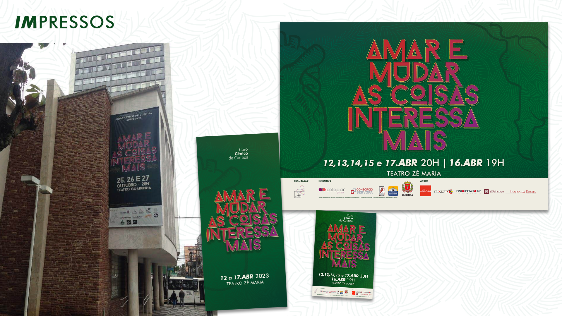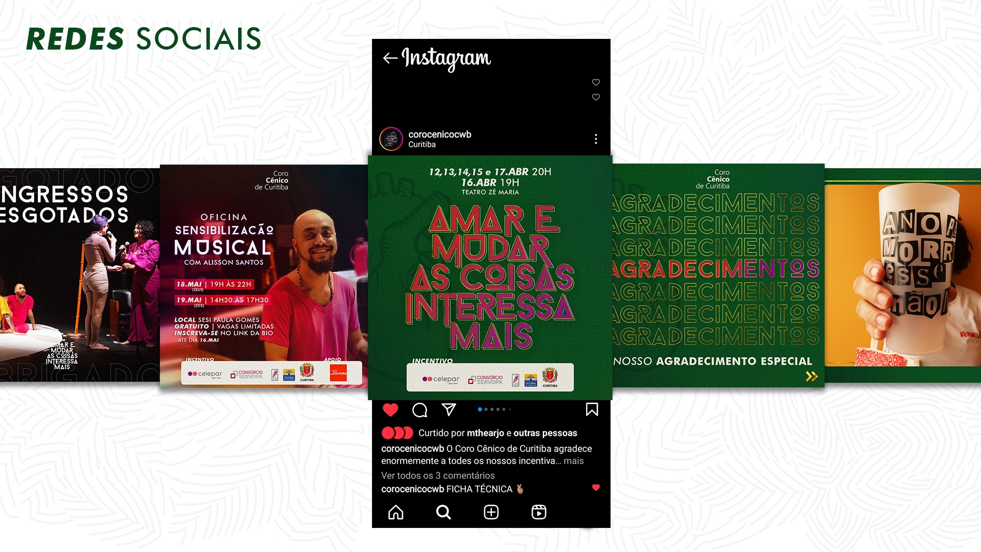 O Coro Cênico é um grupo independente de canto e performance de Curitiba. Desde o primeiro espetáculo que assisti, o sentimento era sempre de orgulho e emoção. Hoje, colaboro como designer voluntário do Coro, produzindo materiais para redes sociais, material gráfico e identidade visual de espetáculos e eventos.